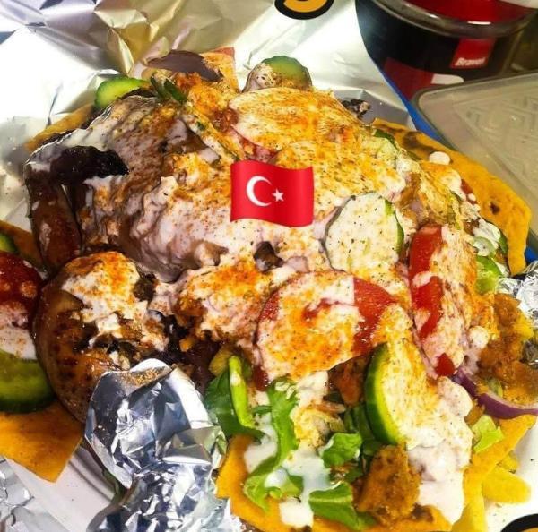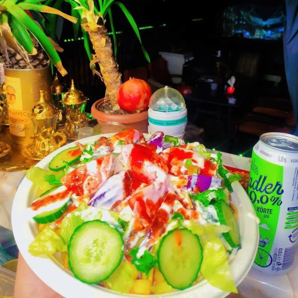 hasábburgonya, gyros hús csirkemellből, saláta mix, lilahagyma, kígyóuborka, paradicsom, házi öntet istanbul öntettel