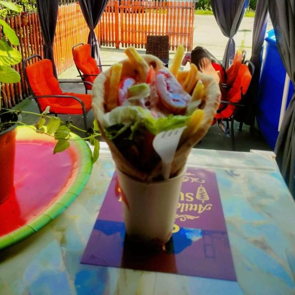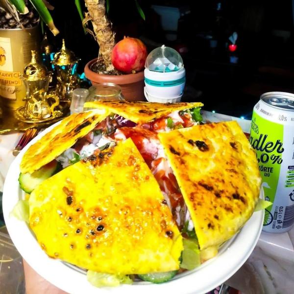 pita, gyros hús csirkemellből, saláta mix, lilahagyma, kígyóuborka, paradicsom, házi öntet pita + választható 0,33l üdítő