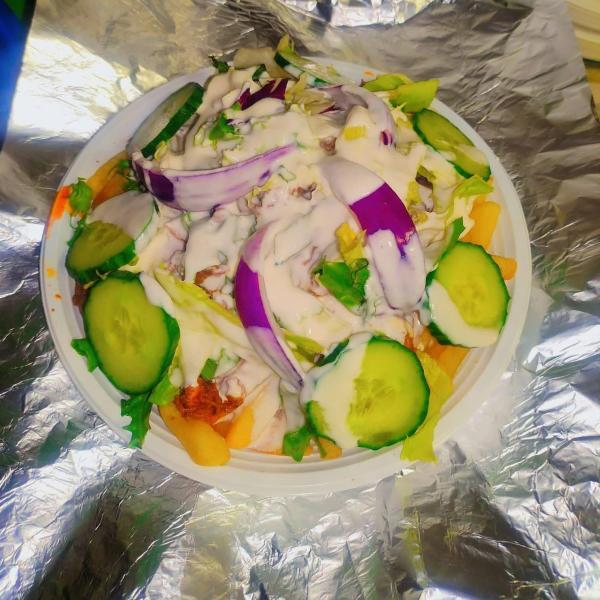 hasábburgonya, gyros hús csirkemellből, saláta mix, lilahagyma, kígyóuborka, paradicsom, házi öntet